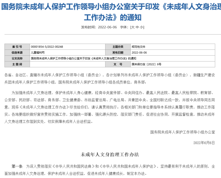 民政部网站6日消息,为加强未成年人文身治理,保护未成年人身心健康,经商中央宣传部、中央网信办、最高人民法院、最高人民检察院、教育部、公安部、民政部、司法部、商务部、卫生健康委、市场监管总局、广电总局、共青团中央、全国妇联达成一致,2022年6月6日,国务院未成年人保护工作领导小组办公室印发《未成年人文身治理工作办法》(以下简称《办法》),对加强未成年人文身治理提出系列工作举措。