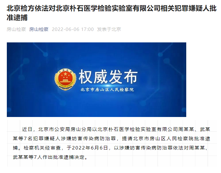 据房山检察消息,近日,北京市公安局房山分局以北京朴石医学检验实验室有限公司周某某、武某某等7名犯罪嫌疑人涉嫌妨害传染病防治罪,提请北京市房山区人民检察院批准逮捕。