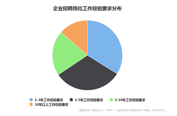 前程无忧早前发布的《2022春季职场跳槽观察》显示,仅有14.5%的受访人群在本年度春季(春节后至四月底)已经完成了跳槽计划,而“35岁+”人群在其中的占比不足二成。招聘岗位分布显示,“10年以上工作经验要求”的招聘岗位量仅占市场现有总需求的一成半,相较之下,“1-3年工作经验要求”和“3-5年工作经验要求”的招聘岗位量合计占比超过六成。