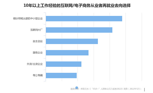 报告称,以近五年来整体招聘需求量始终维持在全行业前五的互联网/电子商务为例,考虑到“35岁+”已超过大多数国有企业/事业单位岗位的限制,具备“10年以上工作经验要求”的“35岁+”互联网/电子商务领域受访者中,47.8%的再就业选择细分领域头部的中小型企业,“降维求稳”心态较为明显。