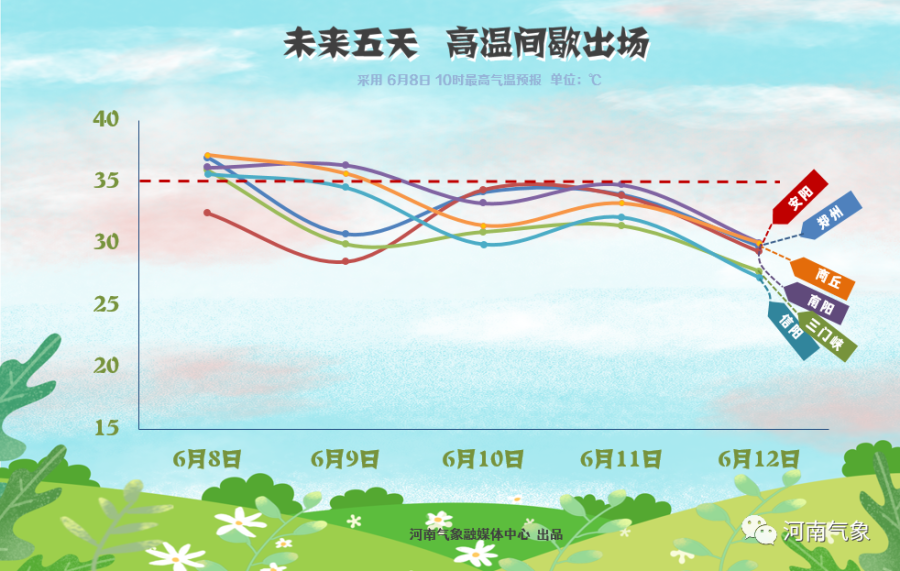 今天下午到夜里,全省晴天转多云,淮河以北有分散性阵雨、雷阵雨,其中濮阳、开封、商丘、三门峡、洛阳南部、新乡东部、郑州东部、周口北部雷雨时局部伴有短时强降水、雷暴大风、冰雹等强对流天气。黄淮之间最高温度达35到37度,部分县市37到39度。