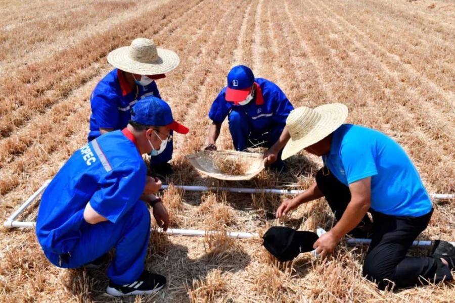 6月2日,在临沂市郯城县郯城街道,工作人员在测算小麦机收减损率。新华社记者 郭绪雷摄