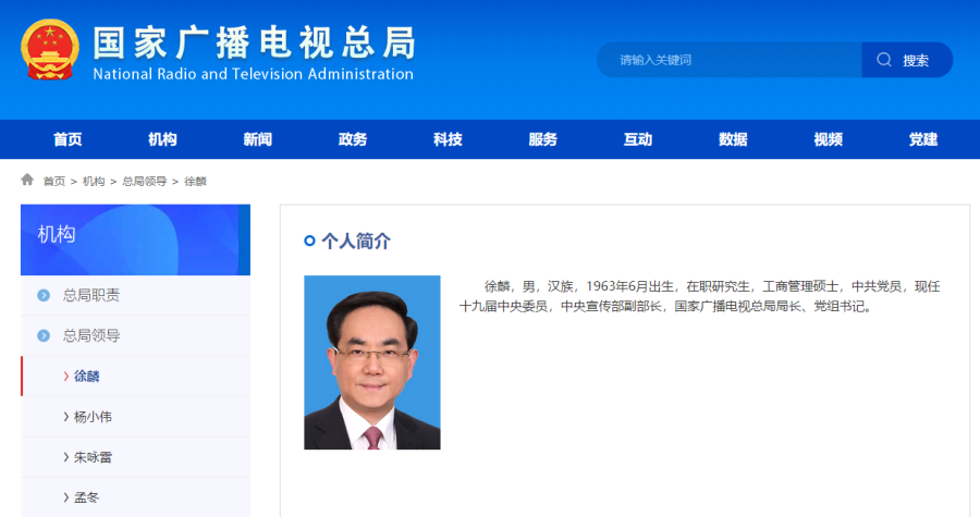 徐麟,男,汉族,1963年6月出生,在职研究生,工商管理硕士,中共党员,现任十九届中央委员,中央宣传部副部长,国家广播电视总局局长、党组书记。