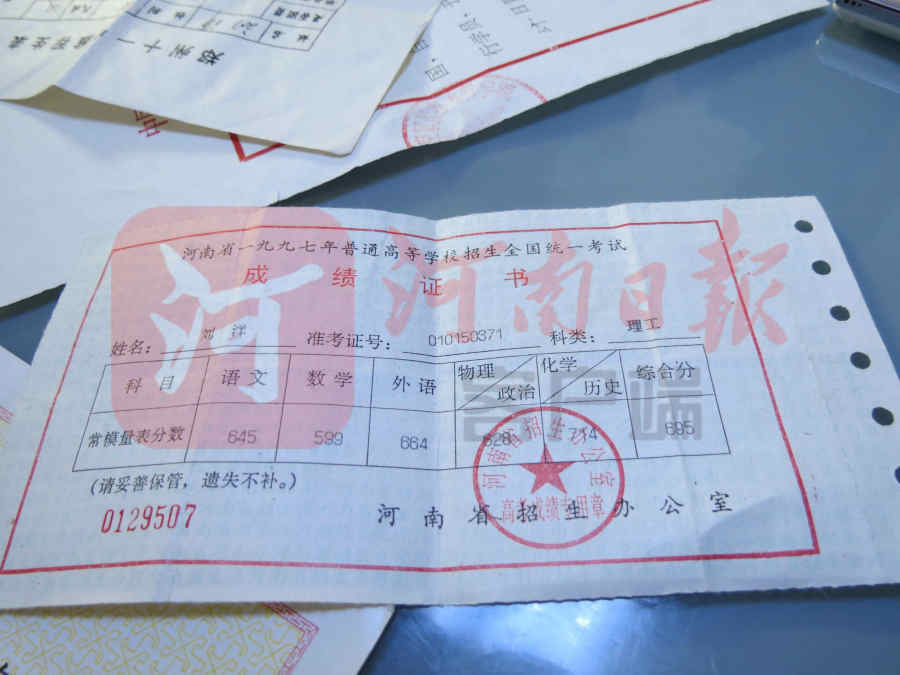 695分——这是刘洋当年的高考成绩,一张泛黄的成绩证书上在“综合分”一栏上铅印着这个数字。
