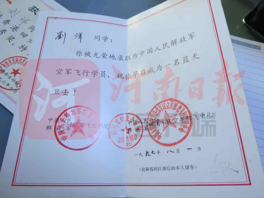 “刘洋同学:你被光荣地录取为中国人民解放军空军飞行学员,祝你早日成为一名蓝天卫士!”1997年8月,刘洋收到了录取通知书,进入中国飞行员的“摇篮”。