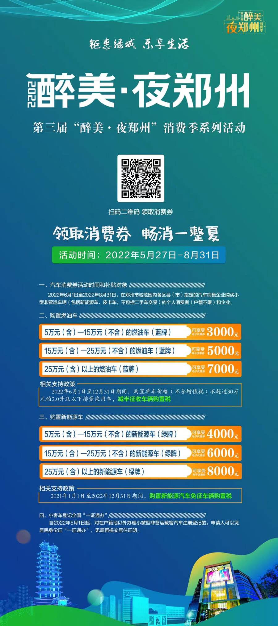 6月1日,第三届“醉美·夜郑州”消费季系列活动汽车消费券补贴细则发布,2022年6月1日至8月31日,在各区指定的汽车销售企业购买5万元以上小型非营运车辆(包括新能源车、皮卡车,不包括二手车交易)的个人(户籍不限)和企业消费者,开具郑州市税务发票以及在郑州市注册上牌后,均有机会领取汽车消费券。