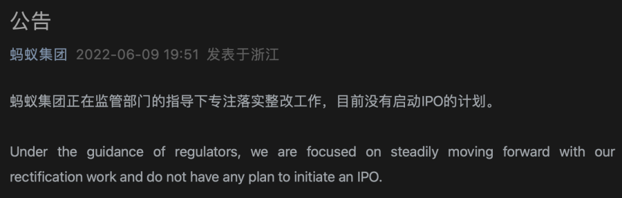 6月9日晚间,蚂蚁集团公告称,正在监管部门的指导下专注落实整改工作,目前没有启动IPO的计划。