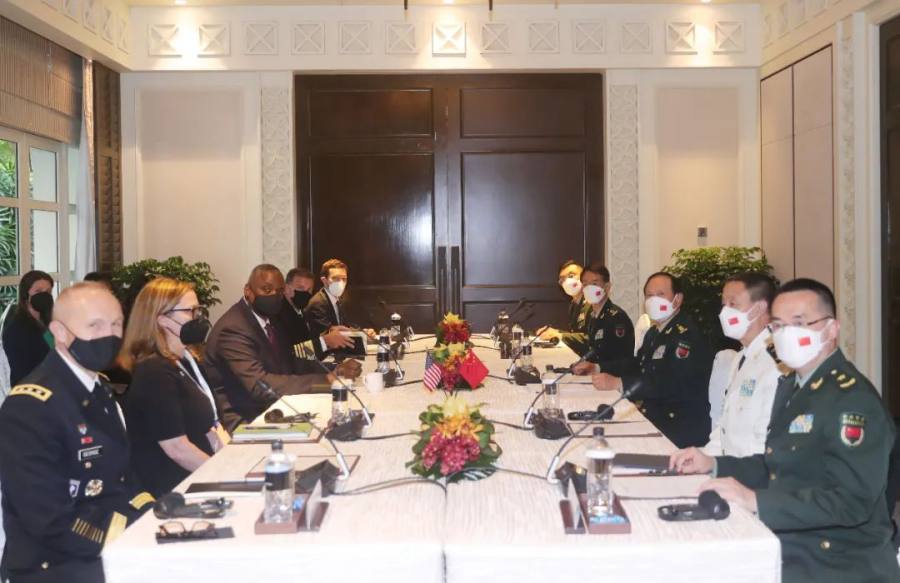 6月10日,正在新加坡出席第19届香格里拉对话会的国务委员兼国防部长魏凤和与同期参会的美国国防部长奥斯汀举行会谈。