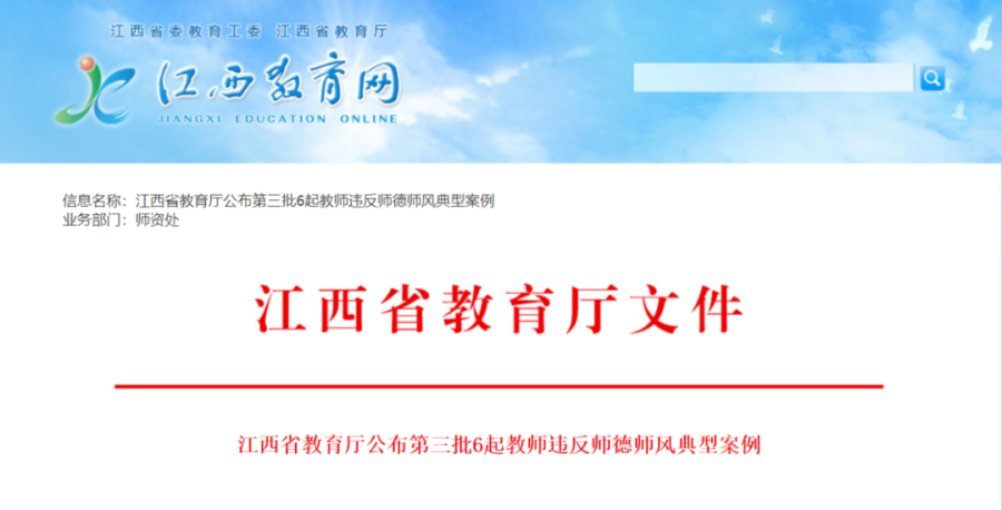 为贯彻落实习近平总书记关于教师队伍建设的重要论述和新时代教师职业行为十项准则,进一步加强师德师风建设,2021年以来,全省各地各校依据相关规定,动真碰硬,严肃查处了一批教师违反师德师风案件。现将6起典型案例公布如下。一、上饶师范学院教师郑某某发表不当言论、与学生保持不正当关系问题2018年以来,上饶师范学院文学与新闻传播学院教师郑某某在微博上发布不当涉政言论,在授课过程中使用不当授课资料,与在校生保持不正当关系。其行为违反了《新时代高校教师职业行为十项准则》第一项和第六项规定。2022年1月,根据《教师资格条例》《事业单位工作人员处分暂行规定》《教育部关于高校教师师德失范行为处理的指导意见》等相关规定,郑某某受到降低岗位等级(降到最低级)、调离教学岗位、撤销高校教师资格、列入教师资格限制库等处理。因教育管理失职,所在学院相关领导已被追究责任。二、江西新能源科技职业学院刘某某等五名教师牟取不当利益问题2021年12月,江西新能源科技职业学院刘某某、赖某某、祁某某、李某某、张某某等五名辅导员在未向所在学院报告的情况下,与校外培训机构合作,组织光伏发电学院5个班级127名学生参加“低压电工证”考试,从中获取中介费17145元。其行为违反了《新时代高校教师职业行为十项准则》第九项和第十项规定。2022年4月,根据《江西省高校教师师德失范行为处理实施办法》等相关规定,刘某某、赖某某、祁某某、李某某、张某某五人受到记大过处分、取消2022年全年绩效考核奖金和两年内职称评定、评优评先资格等处理,相关中介费按有关规定退回,刘某某被免去光伏发电学院团总支书记职务。2021年9月初至国庆节期间,南昌市进贤县青岚学校教师涂某某利用课余时间为本班学生辅导作业,共违规收取辅导费12500元。其行为违反了《新时代中小学教师职业行为十项准则》第十项规定。2022年2月,根据《事业单位工作人员处分暂行规定》《江西省中小学教师违反职业道德行为处理实施办法》等相关规定,涂某某受到记过处分、扣除奖励性绩效工资、降低岗位等级等处理,违规所得按有关规定退回。四、九江市永修县湖东学校教师周某某和恒丰中学教师李某、淦某某在校外培训机构违规兼职问题2021年9月至11月,九江市永修县湖东学校教师周某某和恒丰中学教师李某、淦某某三名教师在永修县某校外培训机构兼职上课,并获取报酬。其行为违反了《新时代中小学教师职业行为十项准则》第四项规定。2021年12月,根据《江西省中小学教师违反职业道德行为处理实施办法》等相关规定,周某某、李某、淦某某三名教师受到记过处分、扣除奖励性绩效工资、取消当年度评优评先及岗位晋升资格、通报批评等处理,违规所得按有关规定退回,永修县湖东学校、恒丰中学被取消当年度评优评先资格。五、萍乡市湘东区特殊教育学校教师孔某某违规兼职问题2019年至2021年,萍乡市湘东区特殊教育学校教师孔某某参与某私立幼儿园管理和招生工作,并违规收取劳务费15000元。其行为违反了《新时代中小学教师职业行为十项准则》第四项规定。2022年1月,根据《中国共产党纪律处分条例》《事业单位工作人员处分暂行规定》《江西省中小学教师违反职业道德行为处理实施办法》等相关规定,孔某某受到党内警告处分、取消两年内评优评先及岗位晋升资格、扣除奖励性绩效工资和奖励性补贴、全区教育系统通报批评等处理,违规收受的劳务费按有关规定退回。2021 年9月至10月,吉安市永丰县恩江中学教师邓某某多次对多名学生实施了打耳光等体罚行为。其行为违反了《新时代中小学教师职业行为十项准则》第五项和《中小学教育惩戒规则(试行)》第十二条规定。2022年1月,根据《江西省中小学教师违反职业道德行为处理实施办法》等相关规定,邓某某受到警告处分、取消当年度评优评先资格等处理。以上6起案例中的涉事教师,无视规定,顶风违纪,触碰了师德底线,损害了群众利益和教师队伍形象,暴露了我省部分市县和学校在教师管理和师德师风建设上还存在薄弱环节,少数教师依法执教意识淡薄、自身修养有待加强。全省各地教育行政部门和各级各类学校要严格落实师德师风第一标准,持续强化教师思想政治和师德师风建设工作,深入开展警示教育,加大师德师风问题查处力度,做到发现一起,查处一起,问责一起。广大教师要以案为鉴,增强依法执教意识,坚守为党育人、为国育才的初心,不断提升个人师德素养,爱岗敬业,廉洁从教,争做党和人民满意的“四有”好老师。