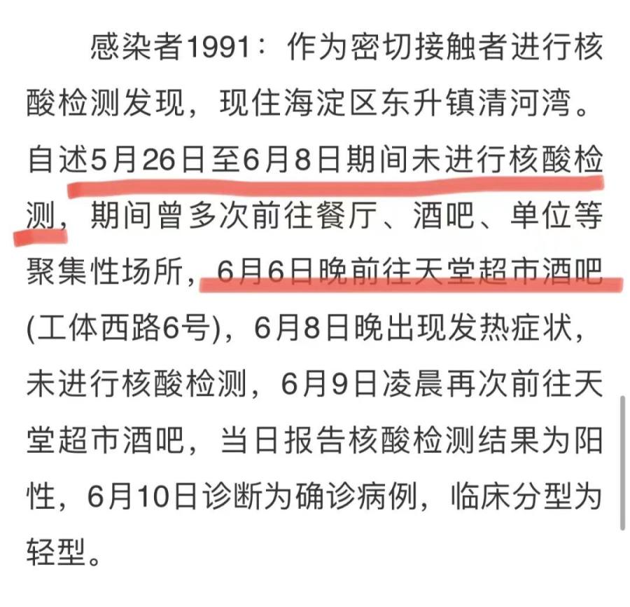 但是,就在10日,北京卫健委公布的“感染者1991”,自述5月26日至6月8日期间未进行核酸检测,6月6日晚前往天堂超市酒吧(工体西路6号),6月8日晚出现发热症状,未进行核酸检测,6月9日凌晨再次前往天堂超市酒吧……