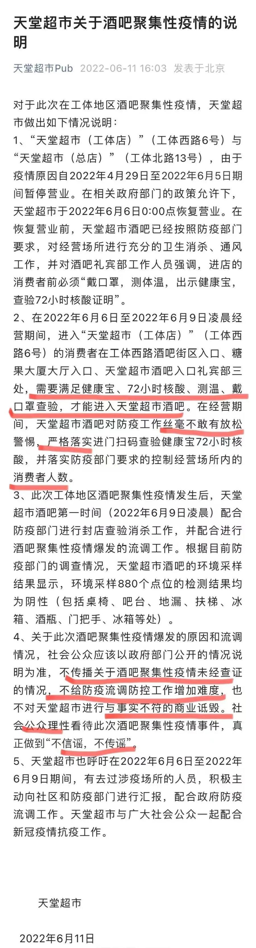 “在2022年6月6日至2022年6月9日凌晨经营期间,进入‘天堂超市(工体店)’(工体西路6号)的消费者在工体西路酒吧街区入口、糖果大厦大厅入口、天堂超市酒吧入口礼宾部三处,需要满足健康宝、72小时核酸、测温、戴口罩查验,才能进入天堂超市酒吧。在经营期间,天堂超市酒吧对防疫工作丝毫不敢有放松警惕,严格落实进门扫码查验健康宝72小时核酸,并落实防疫部门要求的控制经营场所内的消费者人数。”