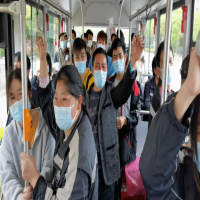 4月24日,闵行区浦江镇谈连方舱医院的康复者在出舱转运车上。赵丹彤摄