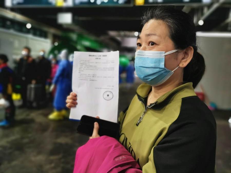4月14日,国家会展中心(上海)方舱医院,宋女士向记者展示她的出院小结。巨云鹏摄