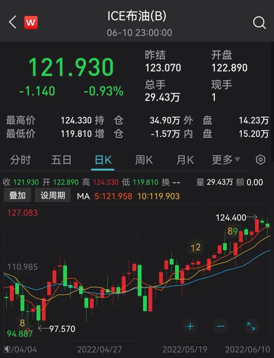 从国际油价走势看,5月中旬以来,受地缘局势冲突、欧盟对俄罗斯能源制裁等影响,国际油价稳步攀升。Wind数据显示,截至6月10日收盘,布伦特原油期货主力合约价格报121.93美元/桶上方,美国原油期货主力合约报120.47美元/桶。