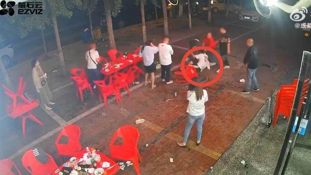 监控视频中,一名施暴者曾两次扯住被打女生的头发,大幅度地拎起该女生将其甩向餐桌,接着三次对其脚踹。站在桌旁的白衣男子见女生被甩至跟前,开始大声阻拦“走了,别打了”,并伸手试图拉开两人。