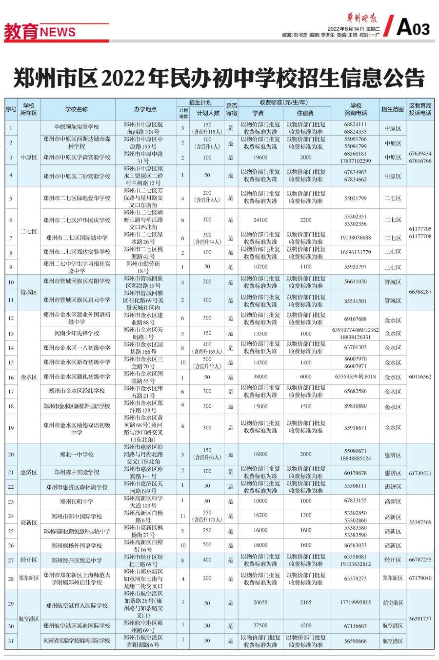 6月14日,郑州市教育局正式发布2022年市区民办初中学校招生信息,向社会公示并接受群众监督。内容如下: