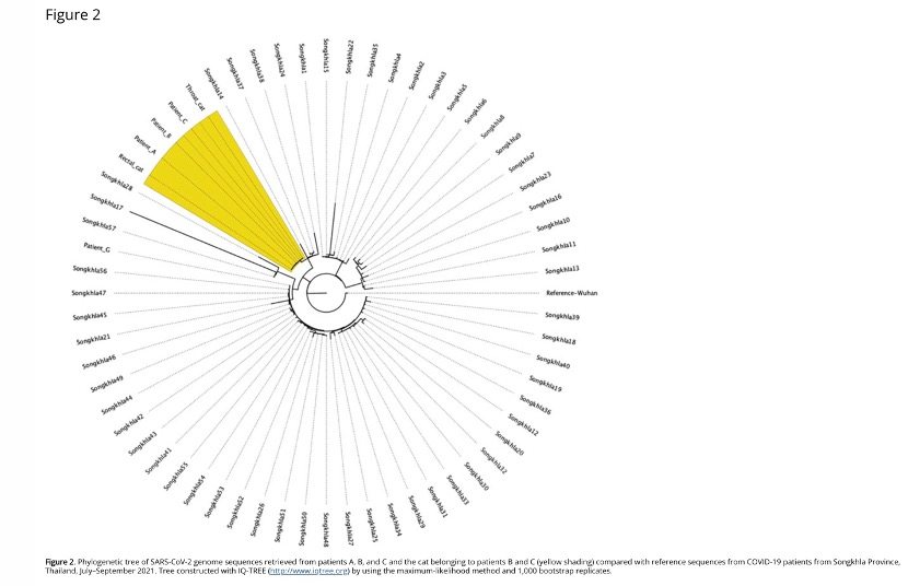 研究者表示,集群中SARS-CoV-2感染传播链可能始于曼谷。已知猫易感染SARS-CoV-2,特别是在与有症状的SARS-CoV-2感染的人类密切互动期间。由于受感染的猫的潜伏期和传染期相对较短,因此这只猫可能在可能将疾病传播给患者A之前不到一周就感染了SARS-CoV-2。