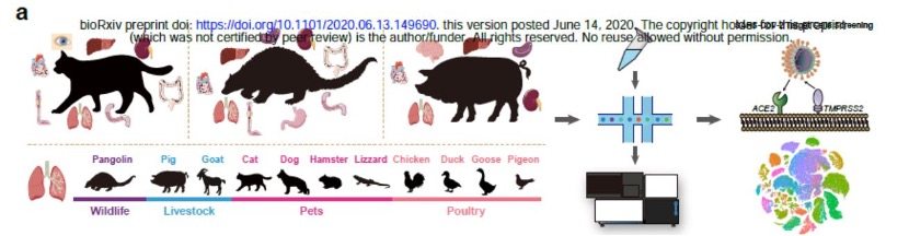 此前,中国研究人员针对穿山甲、猫、家猪这三种新冠易感动物的心脏、肝脏、脾脏、肺、肾脏、大肠等组织创建了高质量且全面的单细胞图谱。研究人员在猫的肺、眼睑、食道(免疫细胞)和直肠(肠内细胞)中检测到了ACE2和TMPRSS2共同表达细胞。
