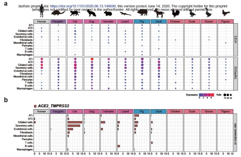 肺是新冠病毒攻击的主要靶器官之一,肺炎也是新冠病毒感染的典型症状。为了评估各种物种的肺细胞中ACE2和TMPRSS2的详细表达模式,研究人员进一步生成了家畜(猪、山羊),家禽(鸡、鸽子、鹅、鸭),宠物(猫、狗、仓鼠、蜥蜴),野生动物(穿山甲)的细胞单核库,共获得了123445个细胞。