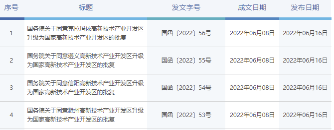 6月16日,国务院批复同意克拉玛依高新技术产业开发区、滁州高新技术产业开发区、信阳高新技术产业开发区、遵义高新技术产业开发区升级为国家高新技术产业开发区。四家国家级高新技术开发区将实行现行的国家高新技术产业开发区政策。