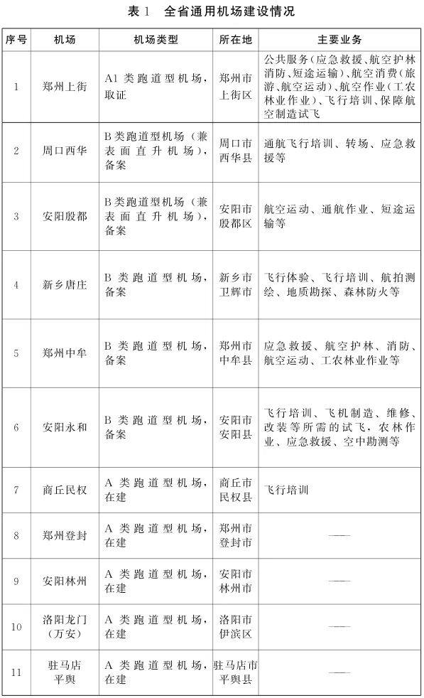 (1)豫中通用机场群。由郑州、开封、许昌3市的通用机场构成,规划新增5个通用机场布点,总数达到8个,服务郑州国家中心城市和郑州国际性综合交通枢纽建设,重点发展航空展会、城市应急救援、医疗救护、空中游览、公务飞行、航空制造等产业。