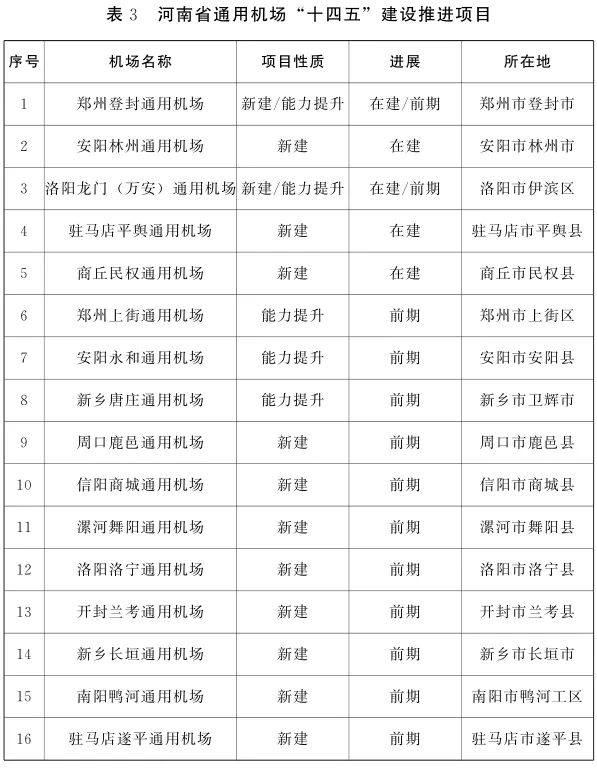 1.通用机场建设稳步推进。“十三五”末,全省共有通用机场6个,其中郑州上街机场获颁A1类使用许可证,安阳殷都(航校)、周口西华、新乡唐庄、郑州中牟、安阳永和等机场完成B类备案,安阳林州、郑州登封、洛阳龙门(万安)、驻马店平舆、商丘民权等机场加快建设,一批通用机场项目前期工作有序开展。