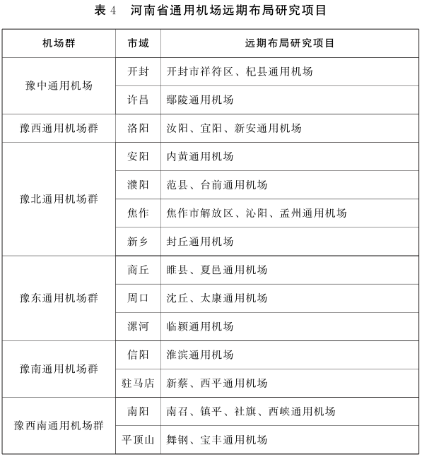 (6)豫西南通用机场群。由南阳、平顶山2市的通用机场构成,规划新增7个通用机场布点,总数达到7个,服务南阳副中心城市建设和南水北调中线水源地、汉江生态经济带发展,重点发展空中巡查、空中游览、应急救援等产业。