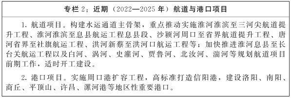 (一)近期(2022—2025年)。重点推进建设淮河、沙颍河、唐河、沱浍河等骨干航道。航道通航里程达到2000公里以上,三级及以上航道达到200公里以上。实施周口港扩容工程,打造周口港多式联运枢纽,大力发展内河集装箱运输;高标准打造信阳港,发挥信阳港淮河门户枢纽港作用,支持信阳大力发展临港产业,构建大别山革命老区对外开放高地。建设洛阳、南阳、商丘、平顶山、许昌、漯河港等地区性重要港口。建设周口、信阳等疏港铁路专用线,完善疏港高等级公路网络。大力发展铁水、河海联运。2025年港口吞吐量达到7000万吨以上(含集装箱30万标箱)。