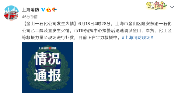 6月18日4时左右,上海石化化工部乙二醇装置区域发生火情,公司立即启动一级预案,目前正在紧急处置中。