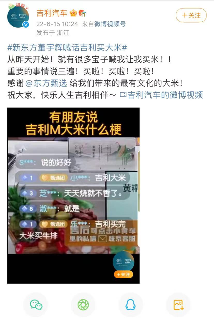 东方甄选的“当红主播”董宇辉立即喊话吉利汽车:“给员工买大米,一名员工买一袋大米,让他们感受生活的喜悦。”吉利汽车随后在微博上回应:“米已买。感谢东方甄选带给我们最有文化大米。”