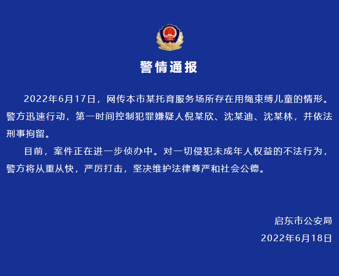 据江苏启东警方通报,2022年6月17日,网传启东市某托育服务场所存在用绳束缚儿童的情形。警方迅速行动,第一时间控制犯罪嫌疑人倪某欣、沈某迪、沈某林,并依法刑事拘留。