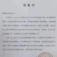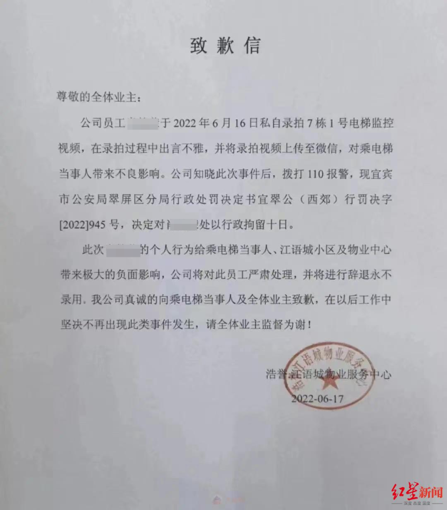 17日下午,宜宾展翔物业管理有限公司浩誉·江语城物业服务中心发布面向全体业主的《致歉信》称:公司员工肖某某于2022年6月16日私自录拍7栋1号电梯监控视频,在录拍过程中出言不雅,并将录拍视频上传至微信,对乘电梯当事人带来不良影响。公司知晓此次事件后,拨打110报警,现宜宾市公安局翠屏区分局行政处罚决定书宜翠公(西郊)行罚决字[2022]945号,决定对肖某某处以行政拘留十日。