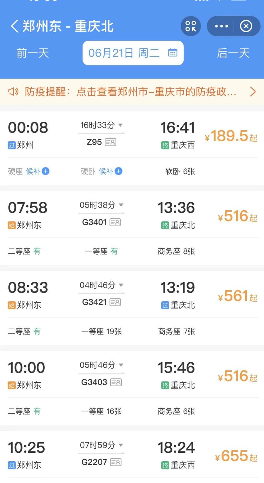 目前,郑州至重庆方向有这些车次:G3401在07时58分从郑州东出发,13时36分到达重庆北,全程5个小时38分;G3421,全程4小时46分;G51,全程4小时38分;G3403全程5小时46分。