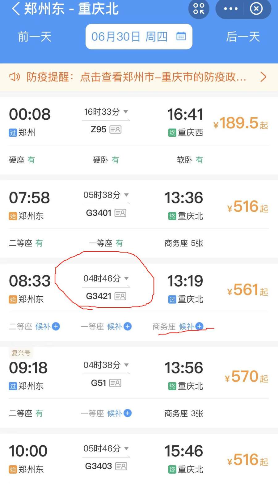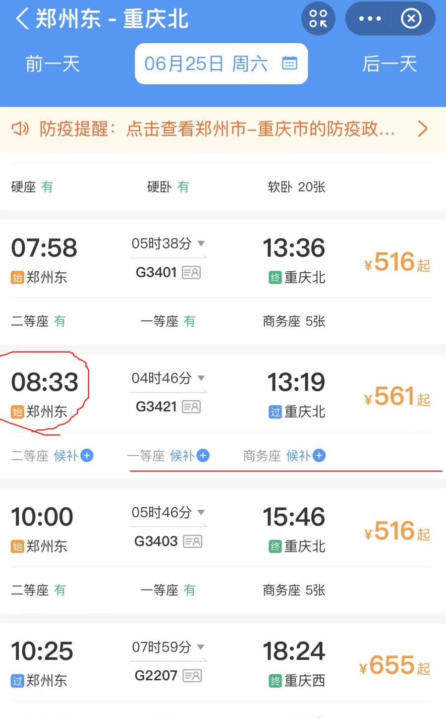正观新闻记者通过12306查询发现,从6月23日(本周四)到6月30日(下周四),郑州东到重庆北的G3421次列车均处于候补购票状态,该车次用时4小时46分,票价最低561元;G51次列车一等座和商务座车票较为紧张。其他时间段及车次车票较为充裕。