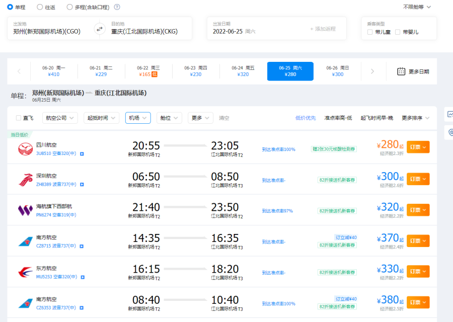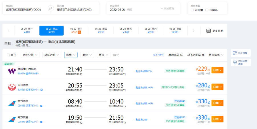 记者查询发现,近十日内,郑州新郑国际机场到重庆江北国际机场最低票价为165元,大部分航班机票为330元左右(约2.2折),周末机票380元左右(约2.5折)。