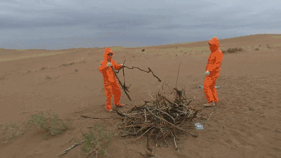 沙漠干旱少雨、空气干燥。面对严酷的自然环境,航天员首先要使用救生电台、卫星定位仪、卫星电话等进行初期的求救联络,然后察看四周地形,利用自然条件、所带装备和返回舱、降落伞等搭建遮阳、保温的掩体,在沙漠里生起篝火、烧水、烹煮食物。