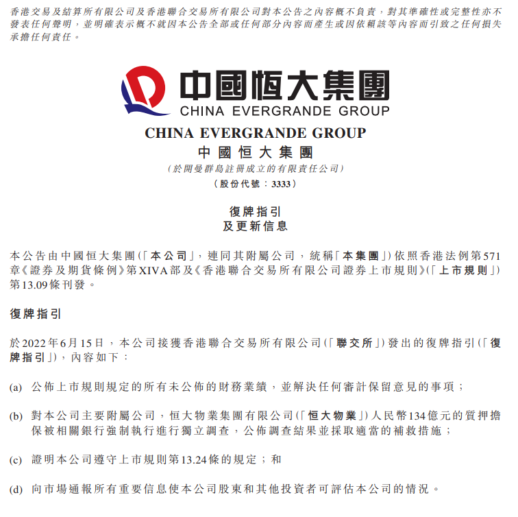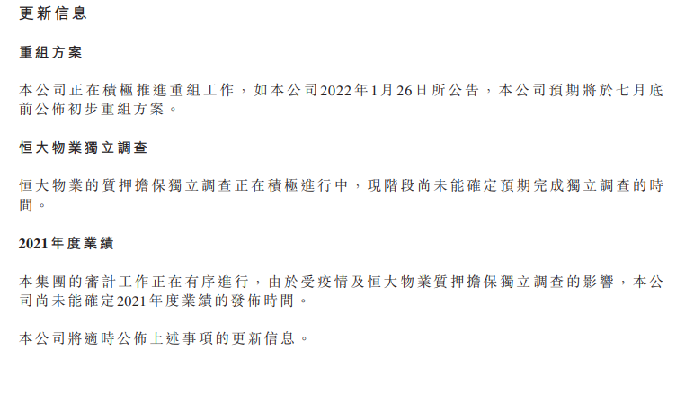 6月20日,中国恒大港交所公告称,预计将在7月底宣布初步重组计划;恒大物业的质押担保独立调查正在积极进行中,现阶段尚未能确定预期完成独立调查的时间。