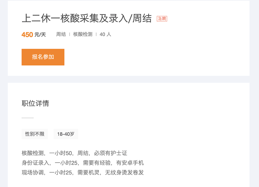 值得注意的是,上海在招募核酸采样员时略有不同。记者从权威渠道了解到,目前上海已有常态化核酸检测点位2万个,此前核酸采样工作都由医护人员承担,但社会常态化采样后,医护人员无法满足大量的采样需求,于是各区面向社会公众紧急招募常态化核酸采样点相关工作人员。