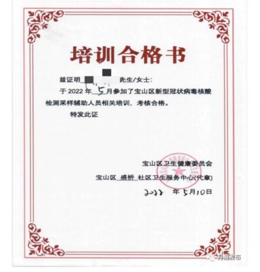 今年5月1日宝山区下发一则通知,在核酸采样点工作人员前期报名工作结束后,由区卫健委举行线上考核,线上考核合格人员,再参加线下技能考核。5月15日,上海宝山公众号发表“一批核酸检测采样辅助人员正式上岗”的文章。文章称,5月13日月浦镇已经有132名核酸检测采样辅助人员持证上岗,完成采样近6万人次。与文章同时配发的还有一张由宝山区卫生健康委员会出具的“培训合格书”。上面写着:“XX于2022年5月参加了宝山区新型冠状病毒核酸检测采样辅助人员培训,考核合格,特发此证。”