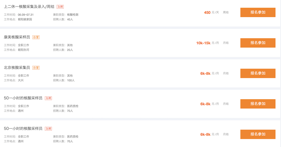 北京的劳务中介李晓莉告诉第一财经记者,目前北京招聘核酸采样员基本都要求具备护士证,招聘方为各大医院。大多数招聘属于兼职,按照日薪结算。“应聘后会跟招聘方(医院那边)签合同,只是说属于兼职类。有的甚至还会交五险一金。”李晓莉说。