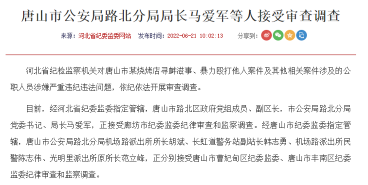 6月21日,河北省公安厅就6月10日发生的“唐山烧烤店打人事件”,发布《关于陈某志等涉嫌寻衅滋事、暴力殴打他人等案件侦办进展情况的通报》。