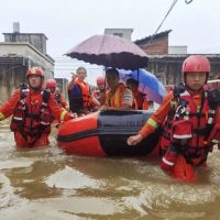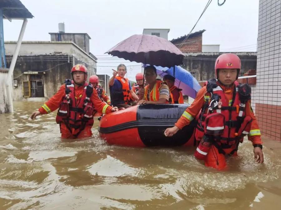 ▲6月21日,在广东省韶关市曲江区樟市镇铁厂村,消防救援人员在转移被困群众。新华社发(周思涛/摄)