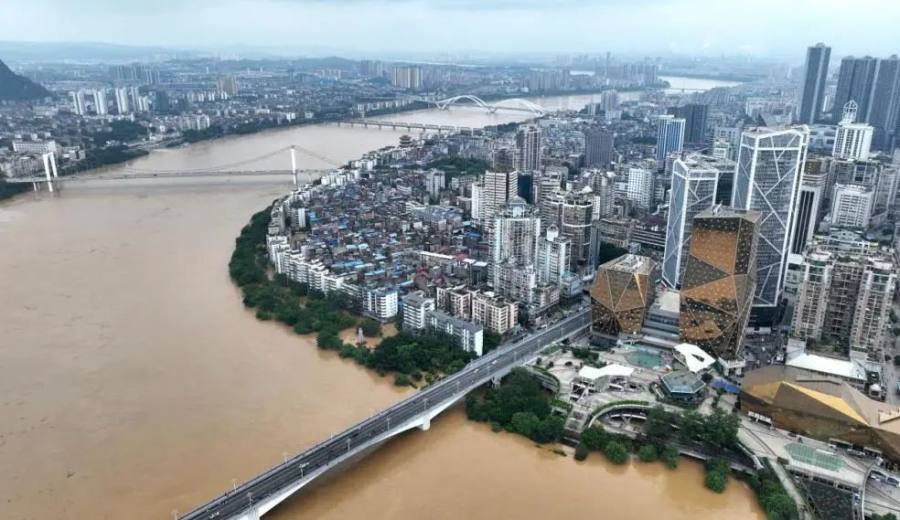 ▲6月21日6时50分,广西柳江柳州水文站出现83.59米的洪峰水位。(黎寒池/人民视觉)