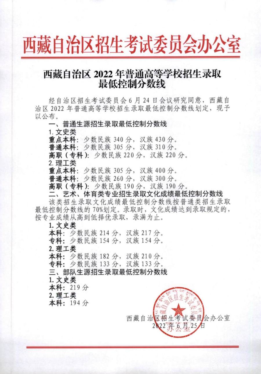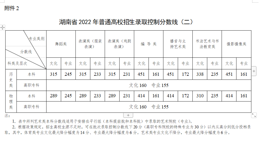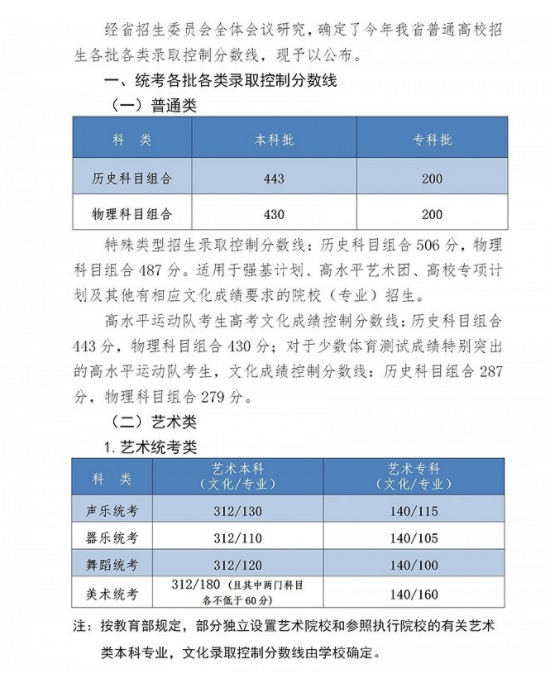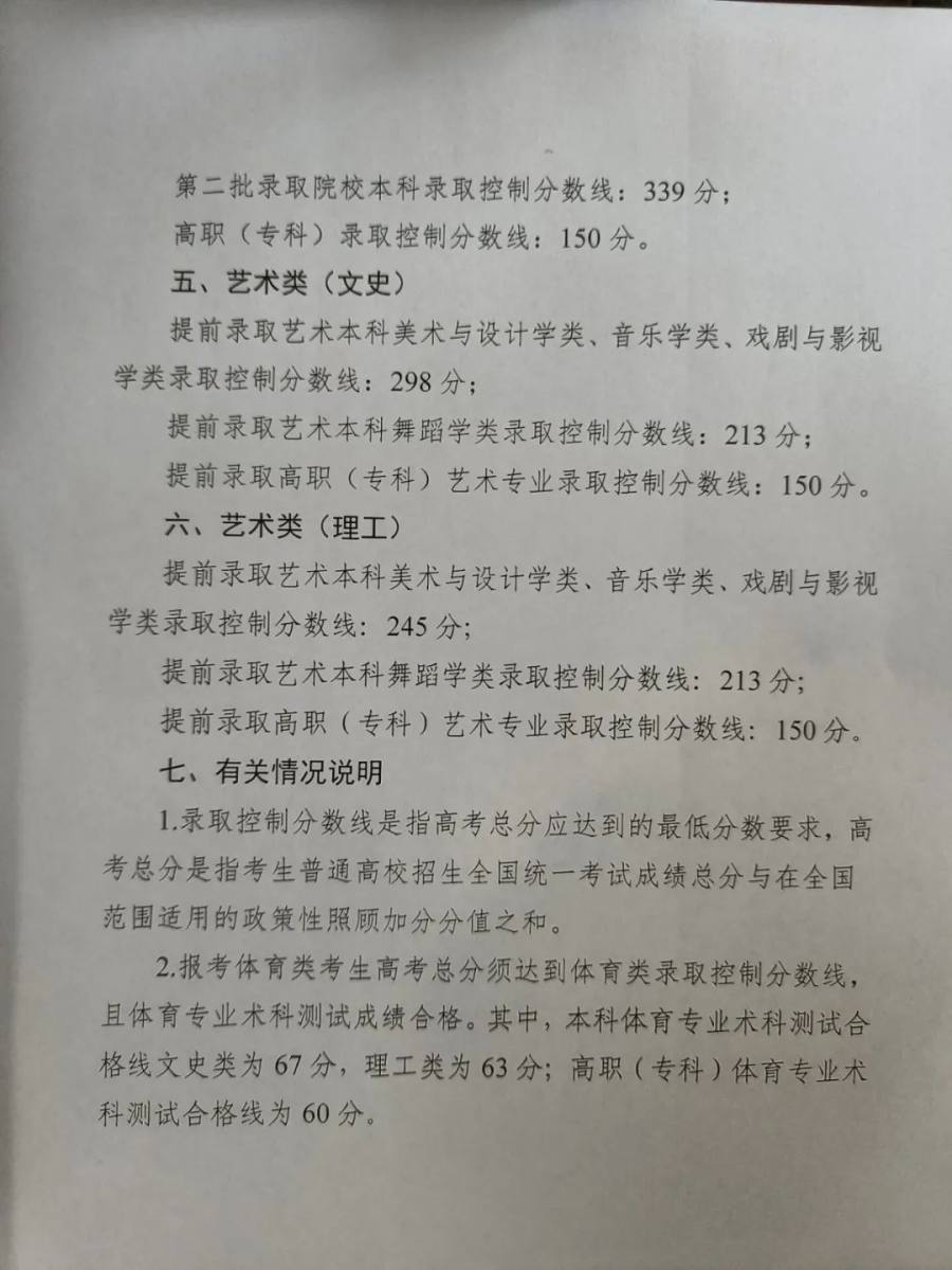 2.艺术类:文学编导类、播音主持类、摄影类本科文化控制线437分,美术类、音乐类、书法类、航空服务艺术类本科文化控制线327分,舞蹈类、影视戏剧表演类、服装表演类本科文化控制线284分;专科文化控制线150分。独立设置的艺术院校和参照执行的艺术类专业,由院校自主划定本科文化控制线。