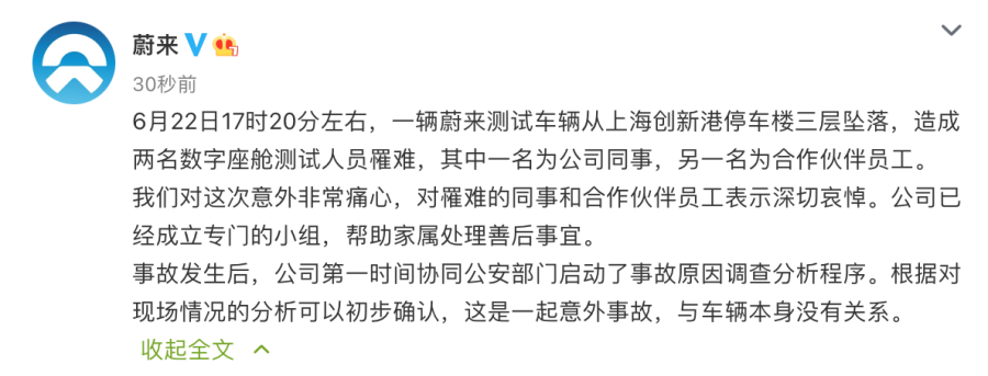 蔚来汽车6月23日晚间于官方微博发布声明称:6月22日17时20分左右,一辆蔚来测试车辆从上海创新港停车楼三层坠落,造成两名数字座舱测试人员罹难,其中一名为公司同事,另一名为合作伙伴员工。