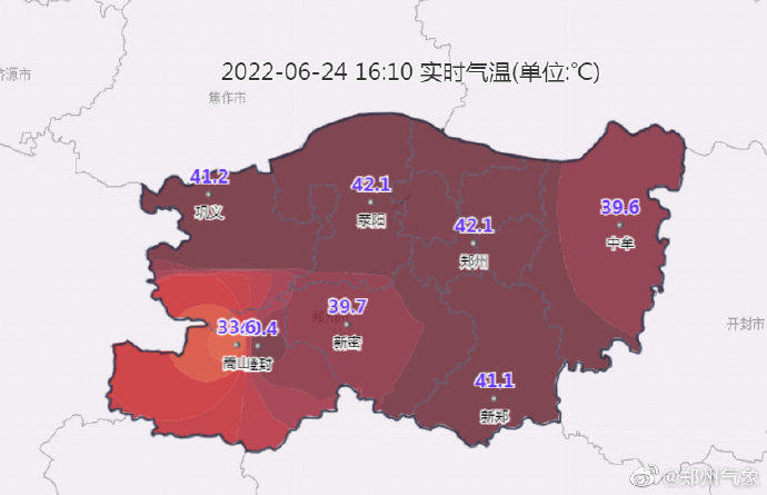 据郑州气象消息,24日郑州站最高气温42.3℃(出现在15:07),突破了郑州站1951年建站以来6月下旬历史极值(42.1℃)。