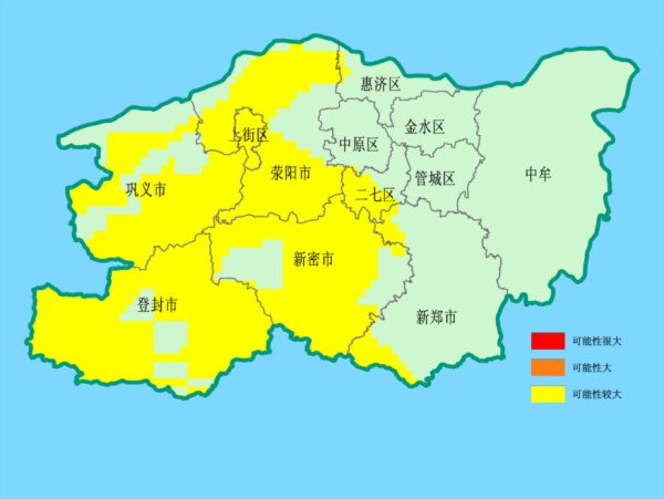 25日下午,郑州市自然资源和规划局和郑州市气象局联合发布郑州市汛期地质灾害气象预报预警。25晚到26日,郑州市地质灾害预警预报达到黄色预警的地区为:巩义、上街、荥阳、新密、登封、二七区大部,新郑西北及西南部,惠济区西部局部,发生地质灾害的可能性较大。请相关区县(市)做好地质灾害防范工作。