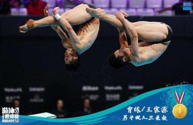 6月26日,在匈牙利首都布达佩斯举行的2022年世界游泳锦标赛跳水项目男子双人三米板决赛中,中国选手曹缘/王宗源获得冠军。