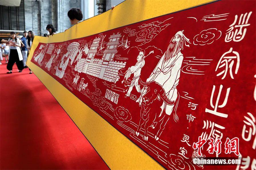一幅长达8米的剪纸艺术品展现老子著经函谷关。中新社发 王中举 摄