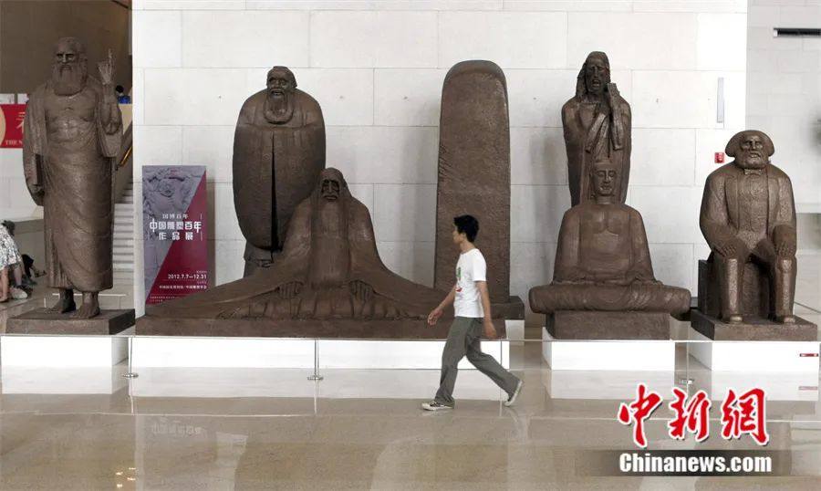 “国博百年·中国雕塑百年作品展”里的一件件雕塑作品将古今中外圣贤排列到一起。中新社发 张浩 摄